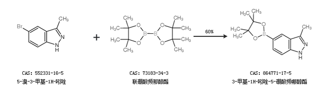 1.通过5-溴-3-甲基-1H-吲唑和联硼酸频那醇酯合成3-甲基-1H-吲唑-5-硼酸频哪醇酯,收率约60%;