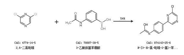 1.通过2,6-二氯吡嗪和3-乙酰胺基苯硼酸合成N-[3-(6-氯-吡嗪-2-基)-苯基]-乙酰胺,收率约54%;