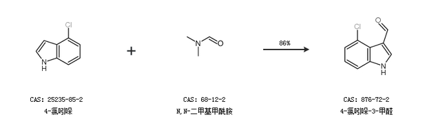 1.通过4-氯吲哚和N,N-二甲基甲酰胺合成4-氯吲哚-3-甲醛,收率约86%;