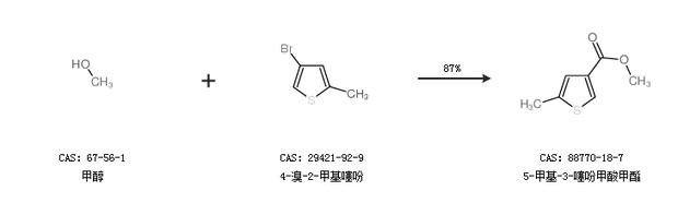 1.通过甲醇和4-溴-2-甲基噻吩合成5-甲基-3-噻吩甲酸甲酯,收率约87%;