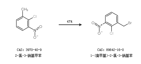 1.通过2-氯-3-硝基甲苯合成1-(溴甲基)-2-氯-3-硝基苯,收率约47%;