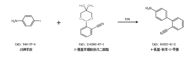 1.通过对碘苯胺和2-腈基苯硼酸新戊二醇酯合成4-氨基-联苯-2-甲腈,收率约53%;