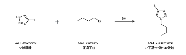 1.通过4-碘吡唑和正溴丁烷合成1-丁基-4-碘-1H-吡唑,收率约99%;