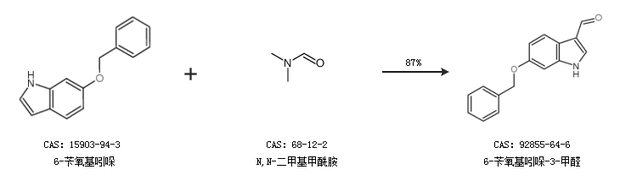 1.通过6-苄氧基吲哚和N,N-二甲基甲酰胺合成6-苄氧基吲哚-3-甲醛,收率约87%;