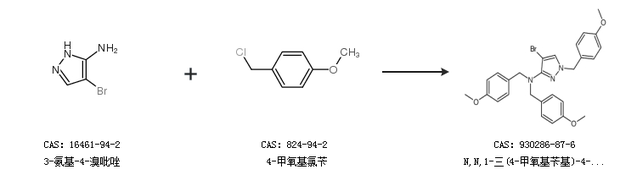 1.通过3-氨基-4-溴吡唑和4-甲氧基氯苄合成N,N,1-三(4-甲氧基苄基)-4-溴-1H-吡唑-3-胺