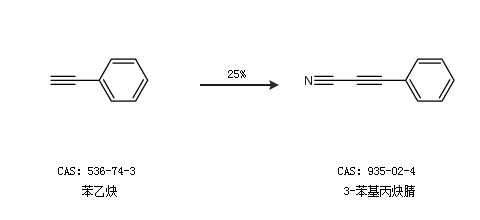1.通过苯乙炔合成3-苯基丙炔腈,收率约25%;