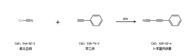 2.通过氰化亚铜和苯乙炔合成3-苯基丙炔腈,收率约80%;