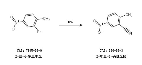 1.通过2-溴-4-硝基甲苯合成2-甲基-5-硝基苯腈,收率约42%;