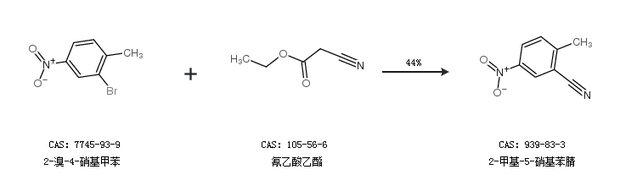 2.通过2-溴-4-硝基甲苯和氰乙酸乙酯合成2-甲基-5-硝基苯腈,收率约44%;