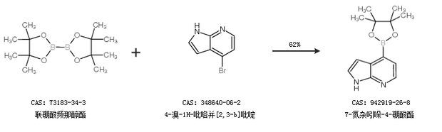 2.通过联硼酸频那醇酯和4-溴-1H-吡咯并[2,3-b]吡啶合成7-氮杂吲哚-4-硼酸酯,收率约62%;