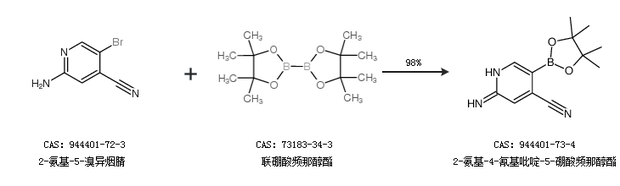 1.通过2-氨基-5-溴异烟腈和联硼酸频那醇酯合成2-氨基-4-氰基吡啶-5-硼酸频那醇酯,收率约98%;