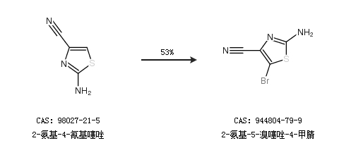 1.通过2-氨基-4-氰基噻唑合成2-氨基-5-溴噻唑-4-甲腈,收率约53%;