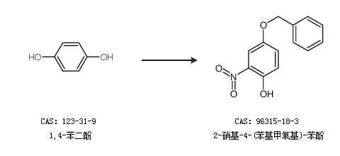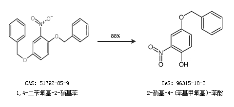 1.通过1,4-二苄氧基-2-硝基苯合成2-硝基-4-(苯基甲氧基)-苯酚,收率约88%;