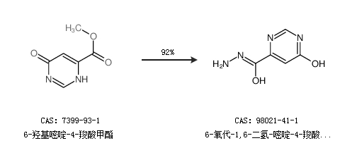 1.通过6-羟基嘧啶-4-羧酸甲酯合成6-氧代-1,6-二氢-嘧啶-4-羧酸 肼,收率约92%;