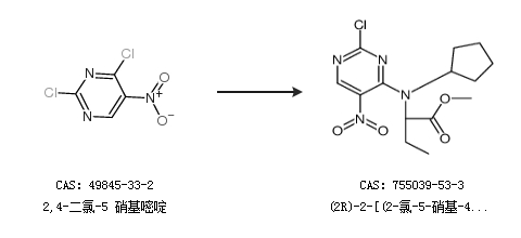 2.通过2,4-二氯-5 硝基嘧啶合成(2R)-2-[(2-氯-5-硝基-4-嘧啶基)环戊胺基]-丁酸甲酯