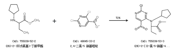 1.通过(2R)-2-(环戊氨基)-丁酸甲酯和2,4-二氯-5 硝基嘧啶合成(2R)-2-[(2-氯-5-硝基-4-嘧啶基)环戊胺基]-丁酸甲酯,收率约72%;