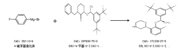 2.通过4-氟苯基溴化镁和(2R)-4-苄基-2-[(1R)-1-[3,5-双(三氟甲基)苯基]乙氧基]吗啉-3-酮合成(2R,3S)-2-[(1R)-1-[3,5-双(三氟甲基)苯基)乙氧基]-3-(4-氟苯基)吗啉