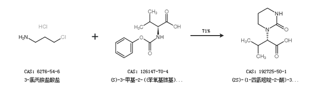 1.通过3-氯丙胺盐酸盐和(S)-3-甲基-2-((苯氧基羰基)氨基)丁酸合成(2S)-(1-四氢嘧啶-2-酮)-3-甲基丁酸,收率约71%;