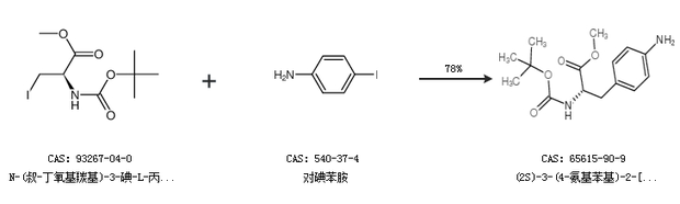 1.通过N-(叔-丁氧基羰基)-3-碘-L-丙氨酸甲酯和对碘苯胺合成(2S)-3-(4-氨基苯基)-2-[(叔丁氧基羰基)氨基]丙酸甲酯,收率约78%;