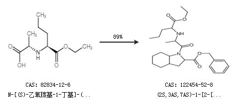 2.通过N-[(S)-乙氧羰基-1-丁基]-(S)-丙氨酸合成(2S,3AS,7AS)-1-[2-[乙氧基羰基-(S)-胺基]-(S)-丙酰基八氢吲哚-2-羧酸苄酯],收率约89%;