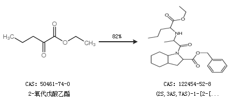 1.通过2-氧代戊酸乙酯合成(2S,3AS,7AS)-1-[2-[乙氧基羰基-(S)-胺基]-(S)-丙酰基八氢吲哚-2-羧酸苄酯],收率约82%;