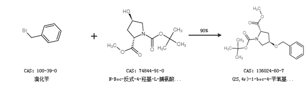 1.通过溴化苄和N-Boc-反式-4-羟基-L-脯氨酸甲酯合成(2S,4r)-1-boc-4-苄氧基吡咯烷-2-二羧酸甲酯,收率约90%;
