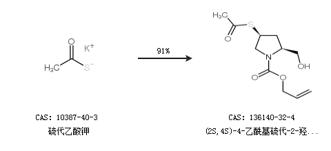 1.通过硫代乙酸钾合成(2S,4S)-4-乙酰基硫代-2-羟基甲基-1-吡咯烷羧酸-2-丙酯,收率约91%;