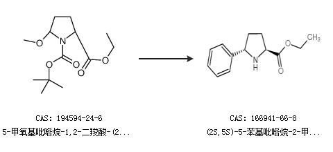 2.通过5-甲氧基吡咯烷-1,2-二羧酸-(2S)-1-叔丁基-2-乙酯合成(2S,5S)-5-苯基吡咯烷-2-甲酸乙酯