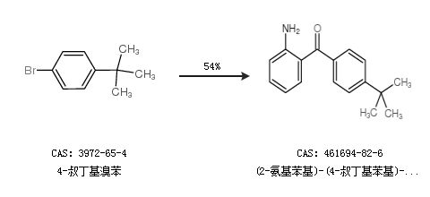 1.通过4-叔丁基溴苯合成(2-氨基苯基)-(4-叔丁基苯基)-甲酮,收率约54%;