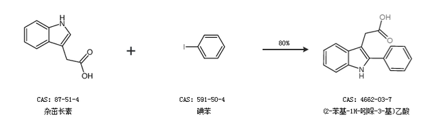1.通过杂茁长素和碘苯合成(2-苯基-1H-吲哚-3-基)乙酸,收率约80%;