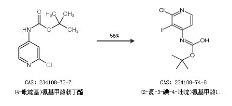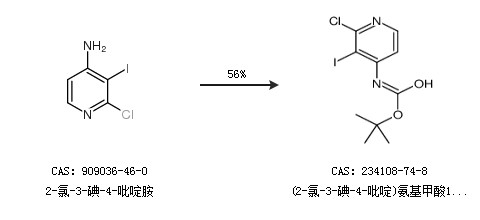 2.通过2-氯-3-碘-4-吡啶胺合成(2-氯-3-碘-4-吡啶)氨基甲酸1,1-二甲基乙酯,收率约56%;