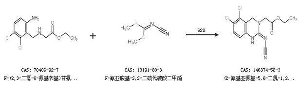 1.通过N-(2,3-二氯-6-氨基苄基)甘氨酸乙酯和N-氰亚胺基-S,S-二硫代碳酸二甲酯合成(2-氰基亚氨基-5,6-二氯-1,2,3,4-四氢喹唑啉-3-基)乙酸乙酯,收率约62%;