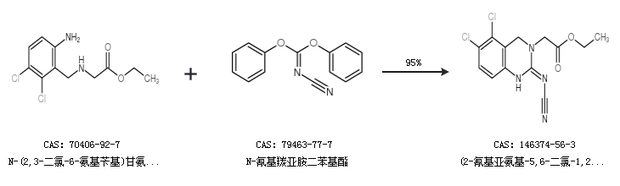 2.通过N-(2,3-二氯-6-氨基苄基)甘氨酸乙酯和N-氰基羰亚胺二苯基酯合成(2-氰基亚氨基-5,6-二氯-1,2,3,4-四氢喹唑啉-3-基)乙酸乙酯,收率约95%;