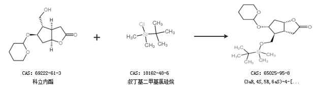 2.通过科立内酯和叔丁基二甲基氯硅烷合成(3aR,4S,5R,6aS)-4-[[[(1,1-二甲基乙基)二甲基硅基]氧基]甲基]六氢-5-[(四氢-2H-吡喃-2-基)氧基]-2H-环戊并[b]呋喃-2-酮
