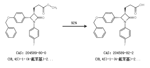 1.通过(3R,4S)-1-(4-氟苯基)-2-氧代-4-[4-(苄氧基)苯基]-3-氮杂环丁烷丙酸甲酯合成(3R,4S)-1-(4-氟苯基)-2-氧代-4-[4-(苄氧基)苯基]-3-氮杂环丁烷丙酸,收率约92%;