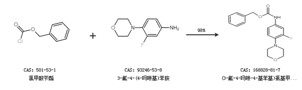 1.通过氯甲酸苄酯和3-氟-4-(4-吗啉基)苯胺合成(3-氟-4-吗啉-4-基苯基)氨基甲酸苄酯,收率约98%;