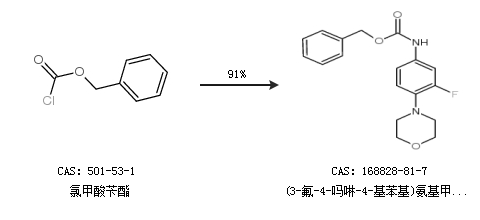 2.通过氯甲酸苄酯合成(3-氟-4-吗啉-4-基苯基)氨基甲酸苄酯,收率约91%;