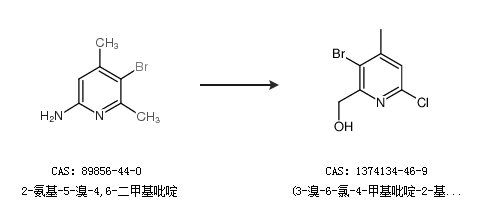 1.通过2-氨基-5-溴-4,6-二甲基吡啶合成(3-溴-6-氯-4-甲基吡啶-2-基)甲醇