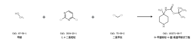 1.通过甲醇、2,4-二氯嘧啶和二氯甲烷合成(4-甲基哌啶-4-基)氨基甲酸叔丁酯