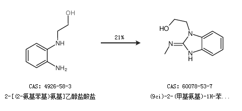 1.通过2-[(2-氨基苯基)氨基]乙醇盐酸盐合成(9ci)-2-(甲基氨基)-1H-苯并咪唑-1-乙醇,收率约21%;