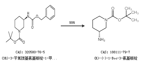 1.通过(3R)-3-苄氧羰基氨基哌啶-1-甲酸叔丁酯合成(R)-(-)-1-Boc-3-氨基哌啶,收率约99%;