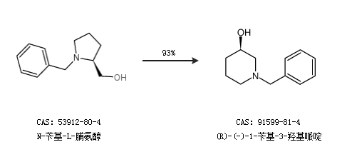 1.通过N-苄基-L-脯氨醇合成(R)-(-)-1-苄基-3-羟基哌啶,收率约93%;