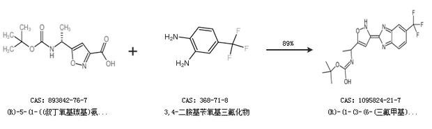 1.通过(R)-5-(1-((叔丁氧基羰基)氨基)乙基)异噁唑-3-羧酸和3,4-二胺基苄氧基三氟化物合成(R)-(1-(3-(6-(三氟甲基)-1H-苯并[d]咪唑-2-基)异噁唑-5-基)乙基)氨基甲酸叔丁酯,收率约89%;