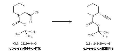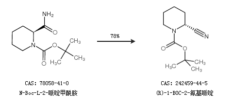 1.通过N-Boc-L-2-哌啶甲酰胺合成(R)-1-BOC-2-氰基哌啶,收率约78%;