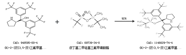 1.通过(R)-2-{双[3,5-双(三氟甲基)苯基]羟甲基}吡咯烷和叔丁基二甲硅基三氟甲磺酸酯合成(R)-2-(双(3,5-双(三氟甲基)苯基)((叔丁基二甲基甲硅烷基)氧基)甲基)吡咯烷,收率约92%;