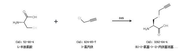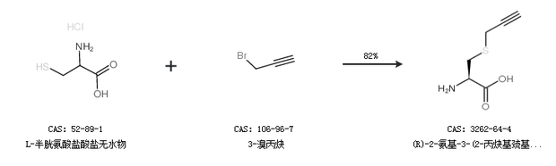 1.通过L-半胱氨酸盐酸盐无水物和3-溴丙炔合成(R)-2-氨基-3-(2-丙炔基巯基)丙酸,收率约82%;