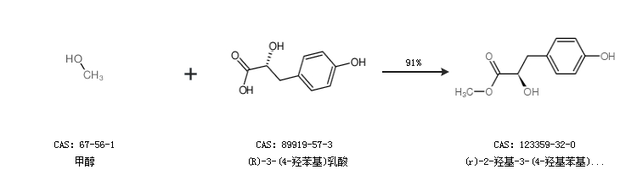 1.通过甲醇和(R)-3-(4-羟苯基)乳酸合成(r)-2-羟基-3-(4-羟基苯基)丙酸甲酯,收率约91%;