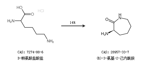 1.通过D-赖氨酸盐酸盐合成(R)-3-氨基-2-己内酰胺,收率约14%;