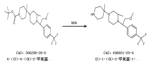 1.通过4-((S)-4-((R)-2-甲氧基-1-(4-(三氟甲基)苯基)乙基)-3-甲基哌嗪-1-基)-4-甲基哌啶-1-羧酸叔丁酯合成(S)-1-((R)-2-甲氧基-1-(4-(三氟甲基)苯基)乙基)-2-甲基-4-(4-甲基哌啶-4-基)哌嗪,收率约98%;