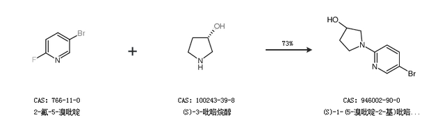 2.通过2-氟-5-溴吡啶和(S)-3-吡咯烷醇合成(S)-1-(5-溴吡啶-2-基)吡咯烷-3-醇,收率约73%;